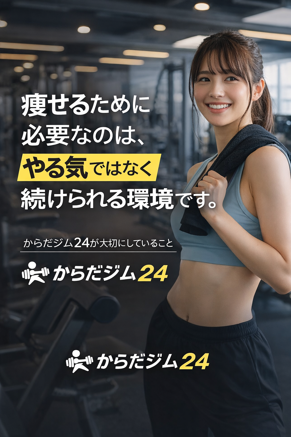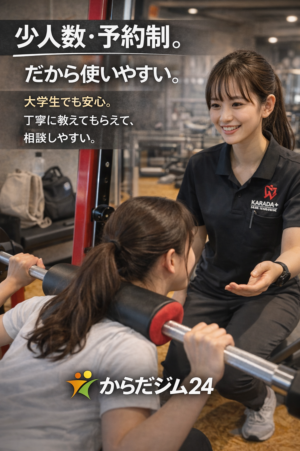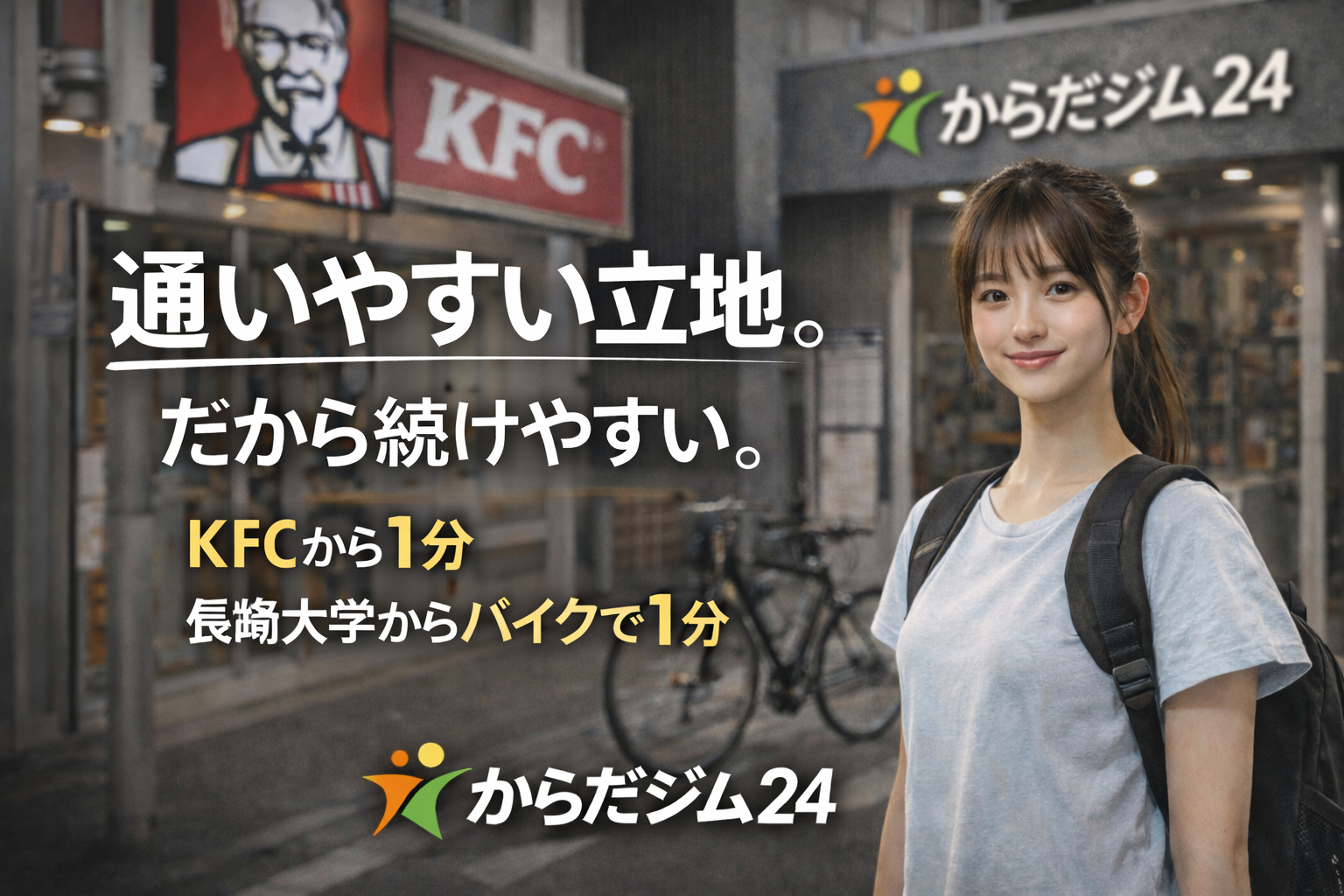会員制24時間ジム「からだジム24」は長崎市住吉駅・若葉町駅エリアの予約制・最大4名までの少人数制トレーニングジムです。無料体験トレーニング3回+入会後半年間の無料パーソナルトレーニングあり。駐車場も完備。