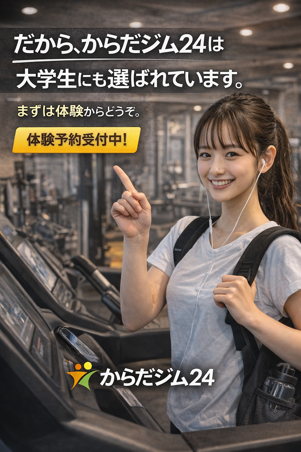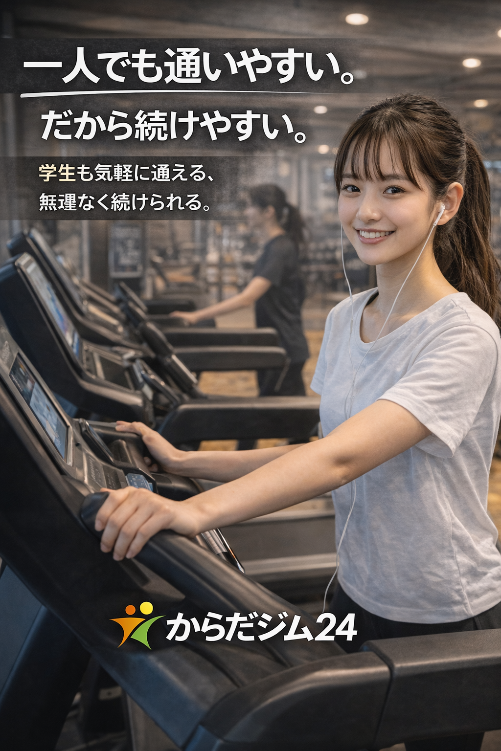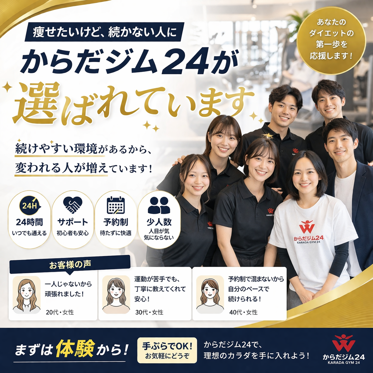 会員制24時間ジム「からだジム24」は長崎市住吉駅・若葉町駅エリアの予約制・最大4名までの少人数制トレーニングジムです。無料体験トレーニング3回+入会後半年間の無料パーソナルトレーニングあり。駐車場も完備。