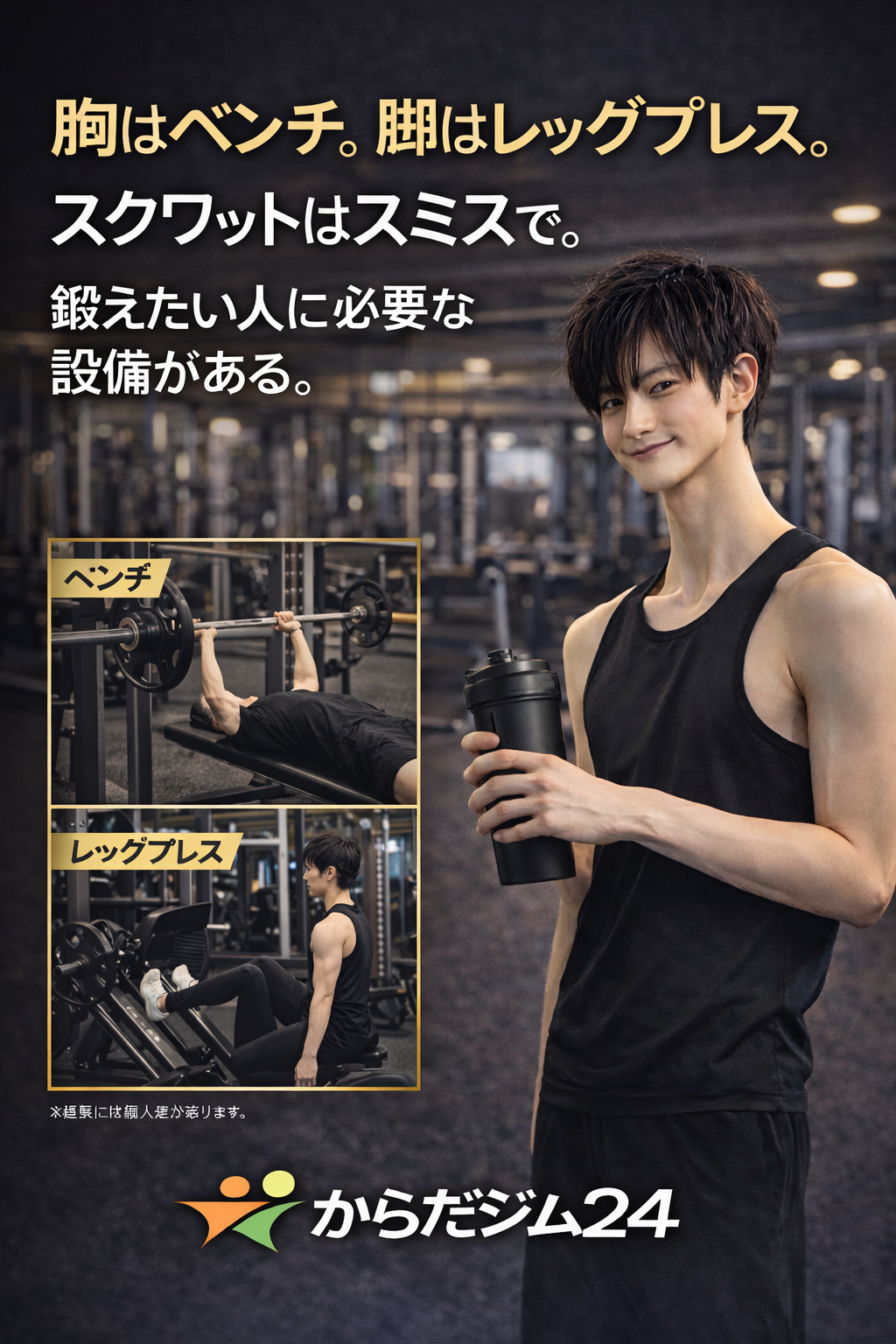 「からだジム24」は、筋力トレーニングから有酸素運動まで、充実したマシン設備を揃えています。あなたのトレーニングを全面的にサポートします。